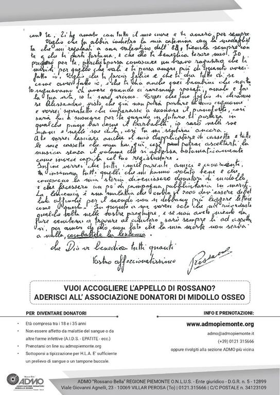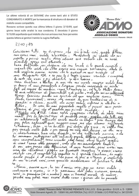 Proprio nell’attesa di un trapianto morì il 9 ottobre 1989 Rossano Bella, giovane villarese che con la sua volontà, espressa nel testamento, diede impulso alla nascita dell’associazione fondata dal padre Mario. «In quegli anni in Italia non c’era ancora una banca dati di potenziali donatori e Rossano spirò aspettando un donazione dall’Inghilterra – racconta Balma –. La lettera testamento, con il suo appello “Per amor di Dio non fate che la mia morte non serva a nulla, combattete la leucemia” viene ancora letta nelle Admo di tutta Italia». Dopo nemmeno un anno nacque a Villar Perosa l’Admo Piemonte e quasi contemporaneamente l’Admo Lombardia: «L’obiettivo era promuovere la banca dati italiana che intanto nasceva a Genova e sensibilizzare le persone ad iscriversi: tutti dovevano sapere che in quel modo avrebbero potuto salvare la vita di una persona. La donazione, legata prima all’ambito famigliare, sarebbe dovuta diventare una responsabilità collettiva».