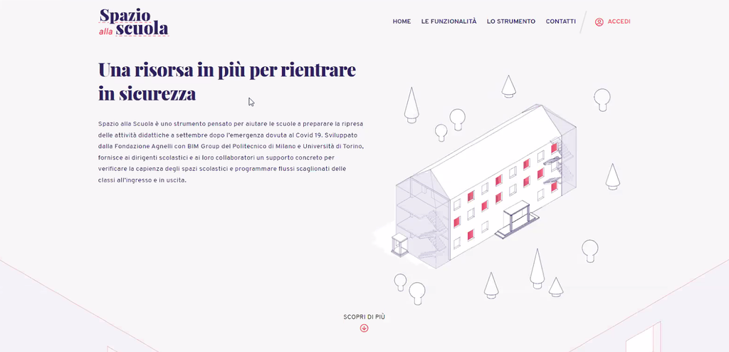 La piattaforma “Spazio alla Scuola” è gratuita e si rivolge direttamente ai dirigenti scolastici, offrendo loro un supporto importante per preparare la ripresa delle attività didattiche ripensando in modo intelligente gli spazi interni alle aule e i percorsi che dovranno seguire i flussi degli studenti in entrata e in uscita.