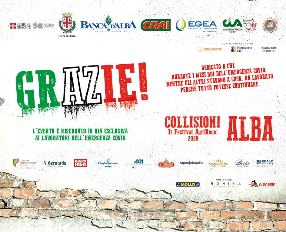 “Abbiamo potuto realizzare questo sogno grazie ai numerosi partner che hanno condiviso con noi un’idea semplice: la convinzione che a tutte queste persone in qualche modo la comunità dovesse dire un Grazie” commenta il direttore artistico di Collisioni, Filippo Taricco. “Questo grande progetto rappresenta una sfida importante per la nostra città” commentano il sindaco di Alba Carlo Bo e l’Assessore al turismo Emanuele Bolla “Siamo orgogliosi di aver lavorato a questo progetto che rappresenta un momento di restituzione a chi ha dato tanto al paese, e al contempo un’occasione di promozione territoriale”. Banca d’Alba è stato un attore principale dell’iniziativa, ed ha contribuito fin dall’inizio alla sua ideazione. “Sono stati mesi molto difficili, in cui Banca d’Alba ha intensificato il proprio impegno economico e sociale a sostegno della comunità” commenta il Presidente di Banca d’Alba Tino Cornaglia “Con la ripartenza ci è parso opportuno ringraziare chi ha garantito i servizi primari con il proprio lavoro e per farlo abbiamo ragionato insieme a Collisioni, al Comune e ad altri attori del territorio per trovare un segnale, un gesto di attenzione verso i veri protagonisti. Siamo felici che questo si sia tramutato in un festival che, in assoluta sicurezza, animerà l’estate albese”.