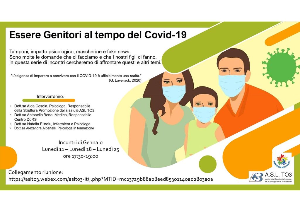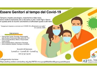 Il secondo progetto è dedicato ai genitori di tutte le scuole, di ogni ordine e grado e nasce dalla proposta di un istituto, il Maria Ausiliatrice di Giaveno, di offrire ai genitori risposte chiare alle numerose domande sul tema del coronavirus. Il titolo del progetto è “Essere Genitori al tempo del COVID-19”. Dopo i primi incontri realizzati per l’Istituto di Giaveno a fine 2020, ai quali hanno partecipato oltre 150 genitori, la proposta è stata estesa a tutti gli istituti del territorio dell’AslTo3, sempre in modalità a distanza, con incontri settimanali di un’ora, cui prendono parte alcuni professionisti dell’azienda sanitaria per rispondere a domande, dubbi e per fornire strumenti di supporto al ruolo genitoriale, per affrontare al meglio e consapevolmente questo particolare periodo.
