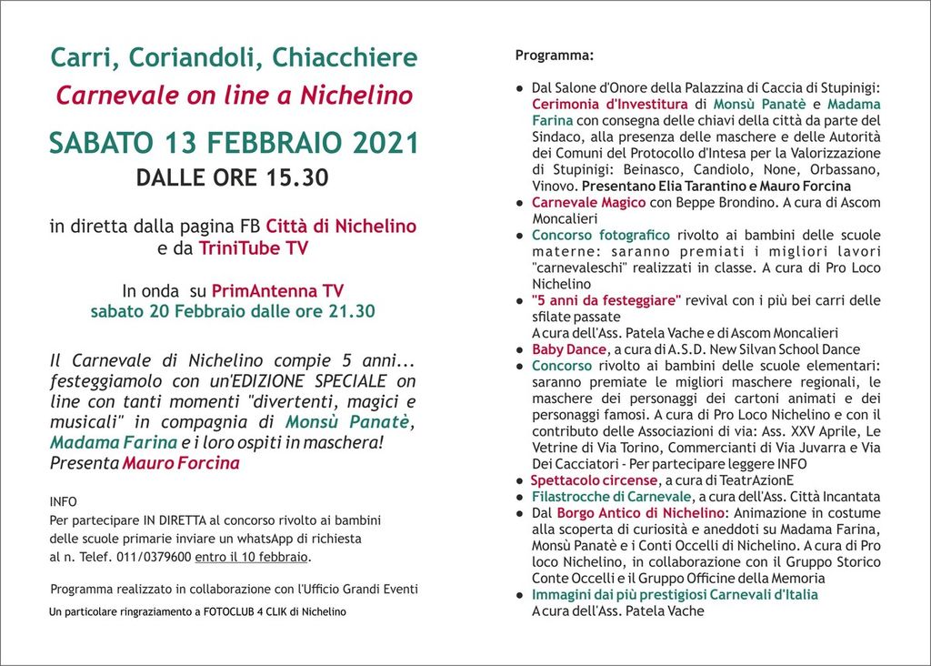 Per evitare gli assembramenti vietati dalla normativa per la prevenzione dei contagi da Covid 19, quest’anno, il Carnevale nichelinese non potrà avere i carri in strada. Si è deciso allora di organizzare un evento online con giochi a premi per i bimbi. La trasmissione andrà in diretta su Facebook e poi, registrata, su PrimAntenna Tv dalle 21.30 di sabato 20 febbraio.