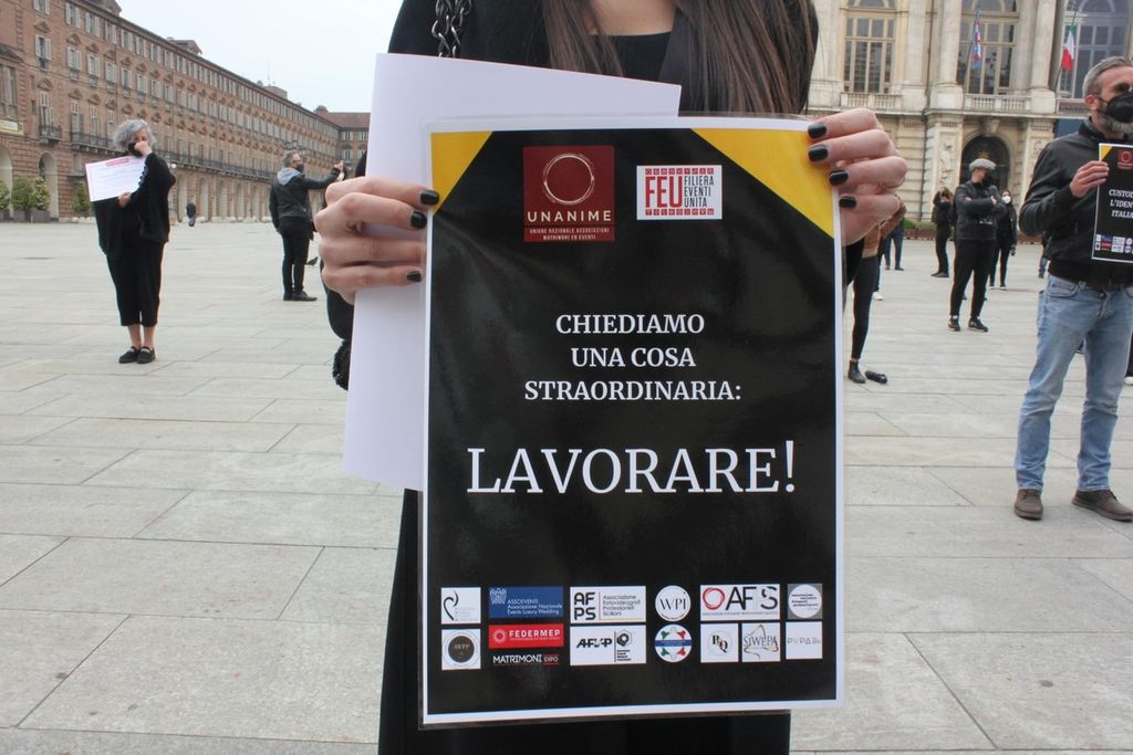 Si sono ritrovati - come molti prima di loro - sotto le finestre della Regione in piazza Castello. Chiedono certezze, soprattutto una data per ripartire. Una manifestazione in contemporanea con altri 11 capoluoghi di Regione, organizzata da UNANIME – la Confederazione delle Associazioni di categoria del settore Matrimoni ed Eventi –, in collaborazione con Filiera Eventi Unita e, per la piazza di Roma, con Insieme per il Wedding. Una cerimonia malinconica, con tutti i partecipanti vestiti di nero a manifestare un lutto per una situazione ormai insostenibile.
