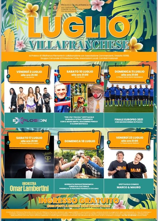 Tocca ai più piccoli festeggiare il Luglio Villafranchese sabato 10 luglio con uno spettacolo di clownerie e magia in via Roma. A partire dalle 21 saliranno sul palco il Mago Smith, Giacomino Pinolo e Clown Bistecca. Domenica 11 sul maxischermo in piazza Santa Maria Maddalena si potrà seguire invece la finale degli Europei di calcio.