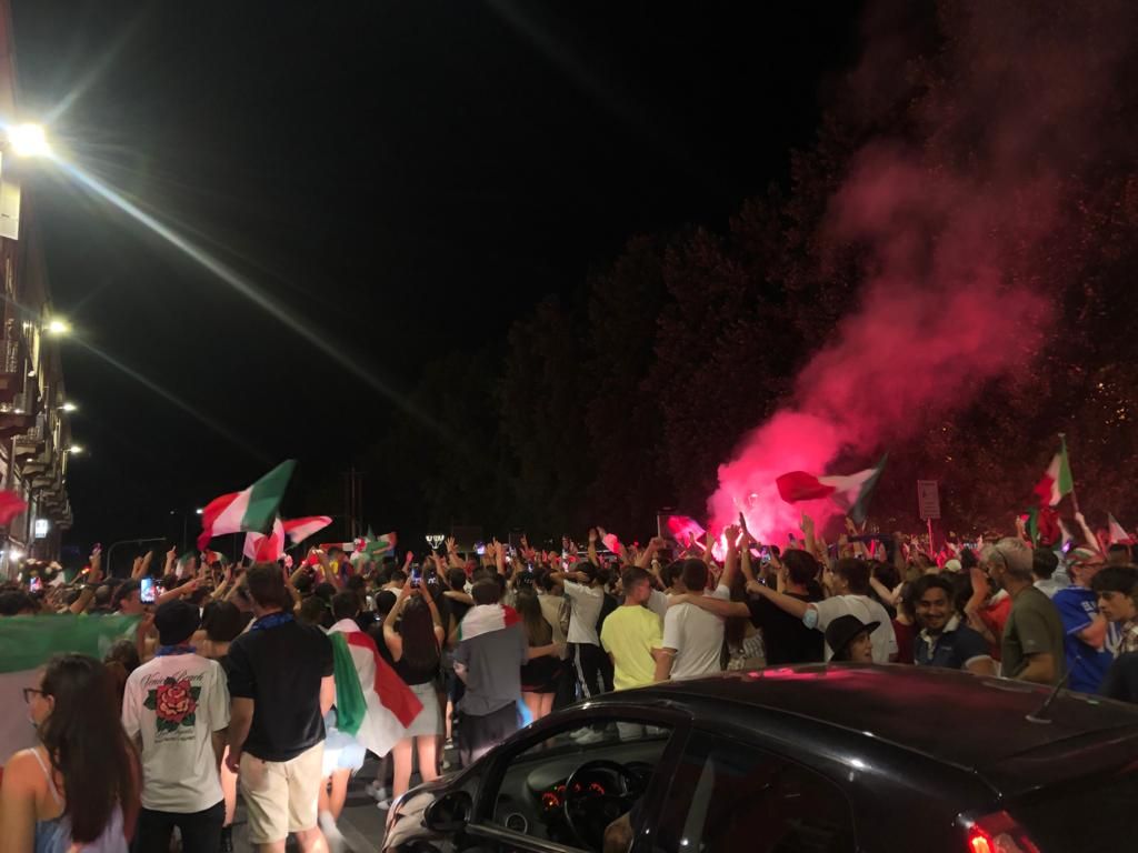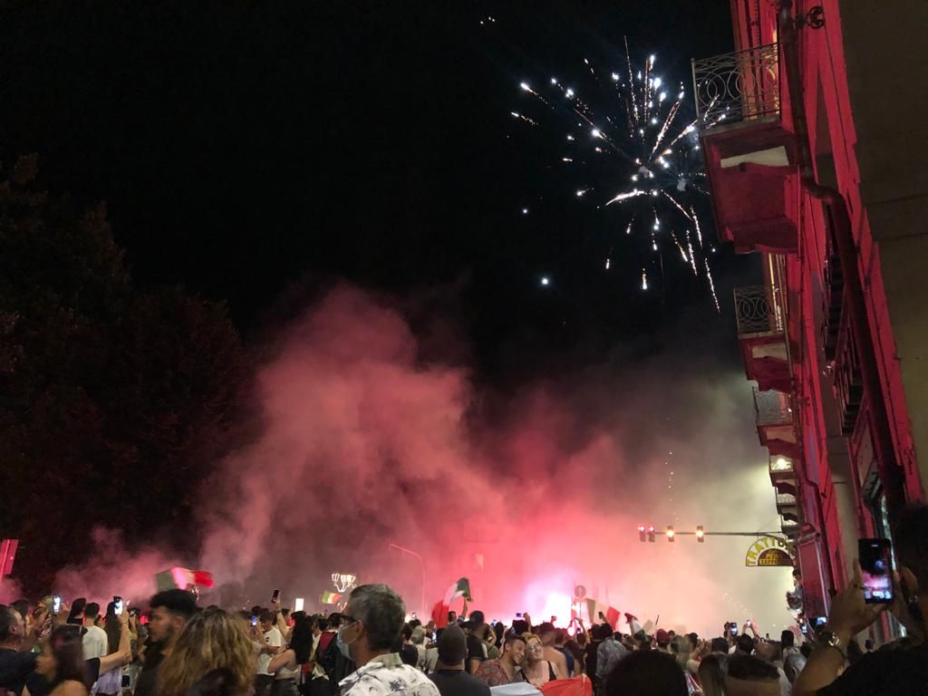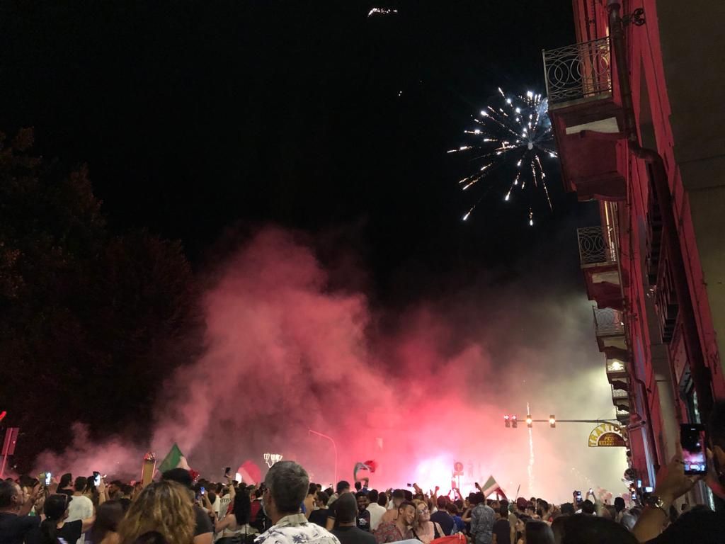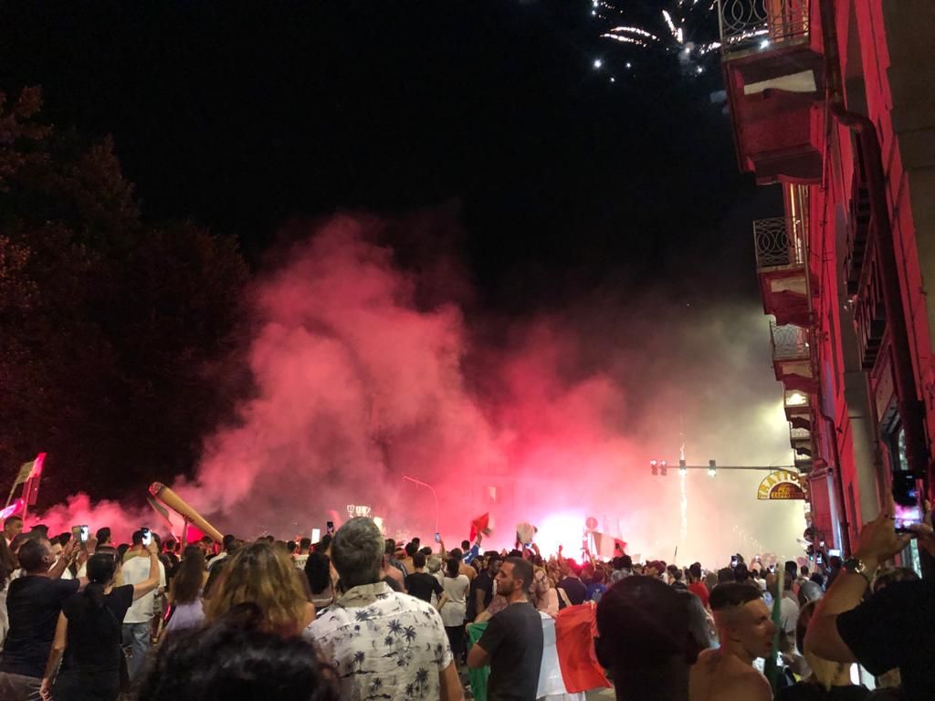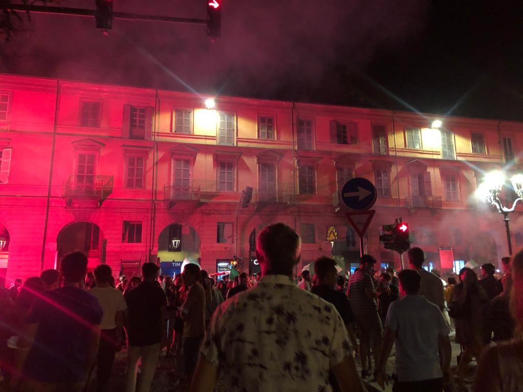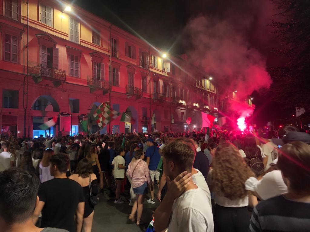 Folla in centro a Pinerolo per la vittoria dell'Italia all'Europeo con tanto di fuochi d'artificio.