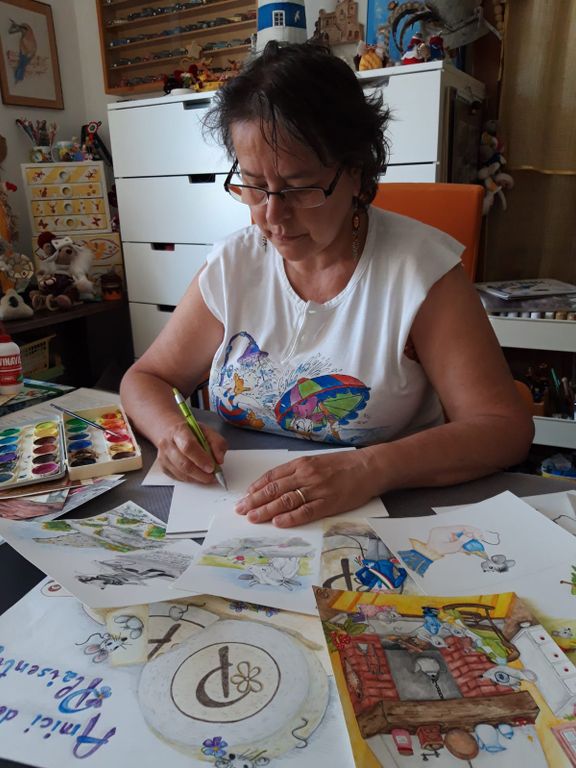 Paola Richaud, oggi pensionata, è l’illustratrice dell’associazione culturale Poggio Oddone di Perosa Argentina: “Avrei tanto voluto frequentare il liceo artistico, ma all’epoca avrei dovuto andare fino a Torino, ancora non c’era a Pinerolo, e i miei non hanno potuto permettermelo. Ma non ho mai smesso di coltivare la mia passione, benché senza basi professionali, e quando con l’associazione si è presentata questa occasione, l’ho colta al volo e con grande gioia”.