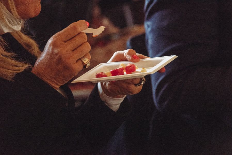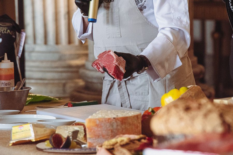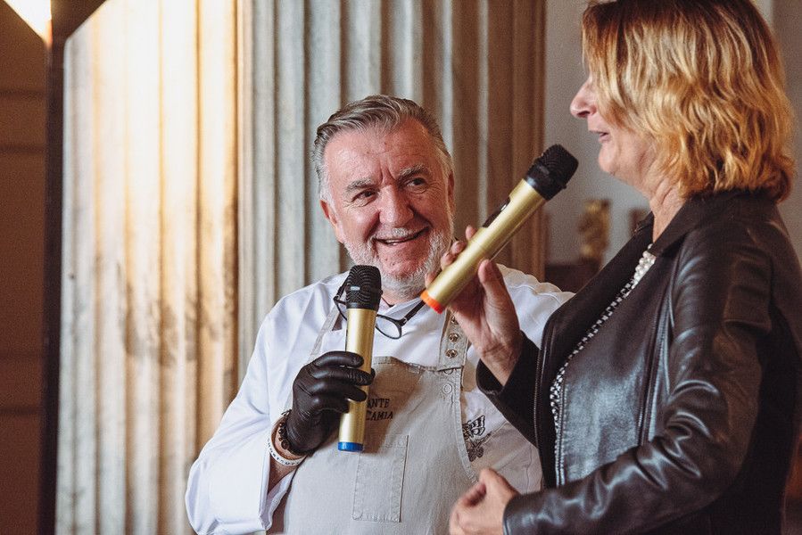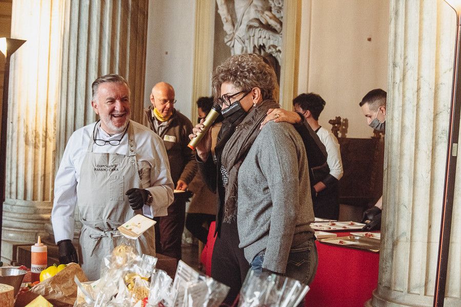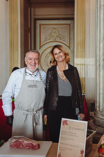 La preparazione del piatto, “Cubo di sottofiletto di Fassone con Peperone rosso di Cuneo, fonduta di Gorgonzola, crema di Aglio di Caraglio e scaglie di Grana”, è avvenuta nella sala di Ercole, mentre lo chef Camia illustrava i passaggi per la preparazione del piatto, la sua squadra, coordinata dalla figlia Elisabetta, sous chef, ha distribuito graditi assaggi al pubblico.