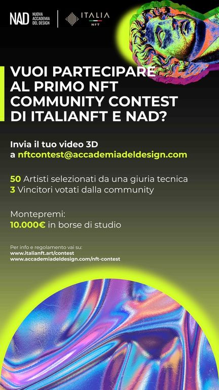 Il termine tassativo per la consegna sarà il giorno 30 Aprile 2022. È previsto un montepremi totale di 10.000,00 euro che sarà così suddiviso: il primo classificato si aggiudicherà una borsa di studio del valore di 6.000,00 euro, il secondo classificato di 3.000,00 euro e il terzo classificato di 1.000,00 euro. In una prima fase la giuria tecnica composta da 5 professionisti del settore selezionerà 50 opere tra quelle ricevute. Le opere selezionate saranno quindi sottoposte alla giuria popolare tramite un sondaggio con voto digitale che si terrà sulla piattaforma www.italianft.art . Tra le opere che riceveranno il maggior numero di voti nel periodo tra il primo maggio e il 31 maggio 2022 verrà formata la classifica e i vincitori saranno comunicati mediante un digital event in programma il 15 giugno prossimo. Il regolamento e tutte le informazioni riguardanti il contest sono consultabili su: www.italianft.art/contest e www.accademiadeldesign.com/nft-contest. Per ItaliaNFT questa iniziativa si inserisce tra le attività volte a promuovere NFT e blockchain come tecnologie incredibili al servizio dell'arte, del design, della cultura e sostenere la multimedialita' come regina della nostra epoca.