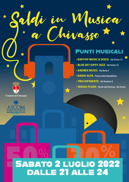 Nella notte tra il 2 e il 3 luglio, a Chivasso arrivano i Saldi in Musica: negozi aperti, vetrine illuminate e tanta musica per residenti e visitatori.