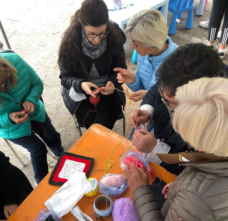 A pochi mesi di distanza, l’obiettivo di realizzare 1.100 mattonelle di 20x20 cm è stato ampiamente raggiunto e superato grazie al contributo di una sessantina di donne del territorio dai venti ai novant’anni, che hanno lavorato sia autonomamente che in gruppo, a volte coinvolgendo più generazioni dalla nonna alla nipotina. È da poco cominciata la seconda fase del progetto, con la cucitura di tutte le mattonelle insieme, andando a formare un albero di sei metri d’altezza.
