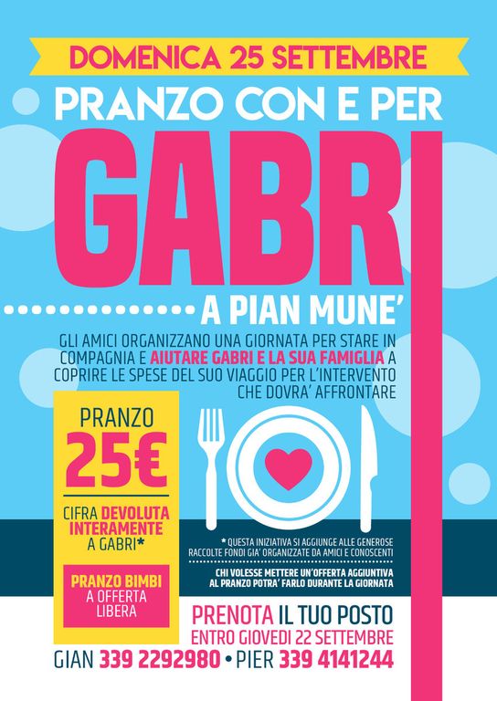 Uniti dalla passione per un luogo speciale come Pian Munè, domenica 25 settembre si organizza per lui un Pranzo nell’area verde di Pian Munè a base di Polenta, il cui intero ricavato sarà devoluto al viaggio e all’intervento di Gabri.