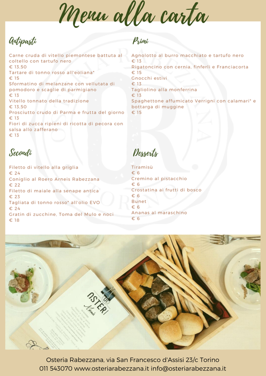 L'Osteria Rabezzana, è stata inserita anche fra i Ristoranti della Tavolozza, e si trova a Torino in Via San Francesco D'Assisi, 23/c.