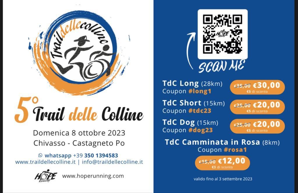 Si ricorda che fino al 3 settembre è possibile iscriversi al Trail delle Colline 2023 a tariffa agevolata sfruttando il coupon sconto realizzato grazie al sostegno di Dòm’s Cocktail Bar Chivasso e Wellness Klab Castelrosso.