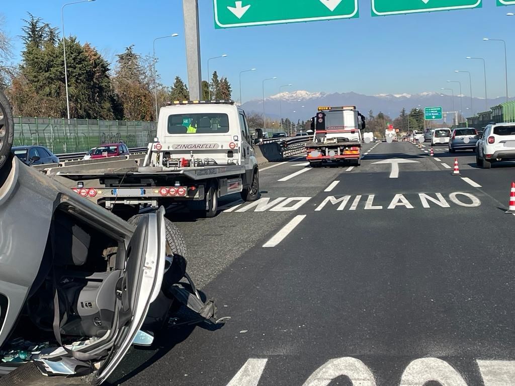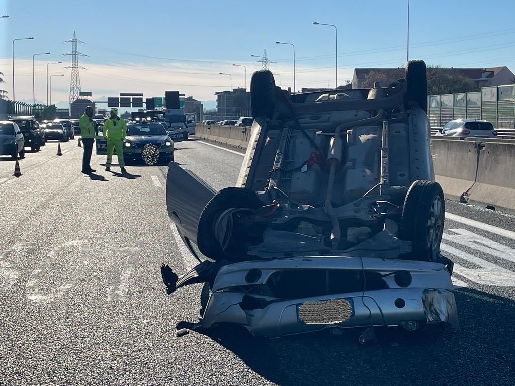 Scontro in tangenziale, un'auto si ribalta sulla carreggiata a testa in giù: due feriti, disagi al traffico