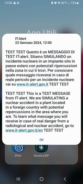Questo il contenuto del messaggio, ripetuto anche in inglese: “TEST TEST Questo è un MESSAGGIO DI TEST IT-ALERT. Stiamo SIMULANDO un incidente nucleare in un impianto sito in paese estero con potenziali ripercussioni nella zona in cui ti trovi. Per conoscere quale messaggio riceverai in caso di reale pericolo per un incidente nucleare vai su www.it-alert.gov.it TEST TEST”