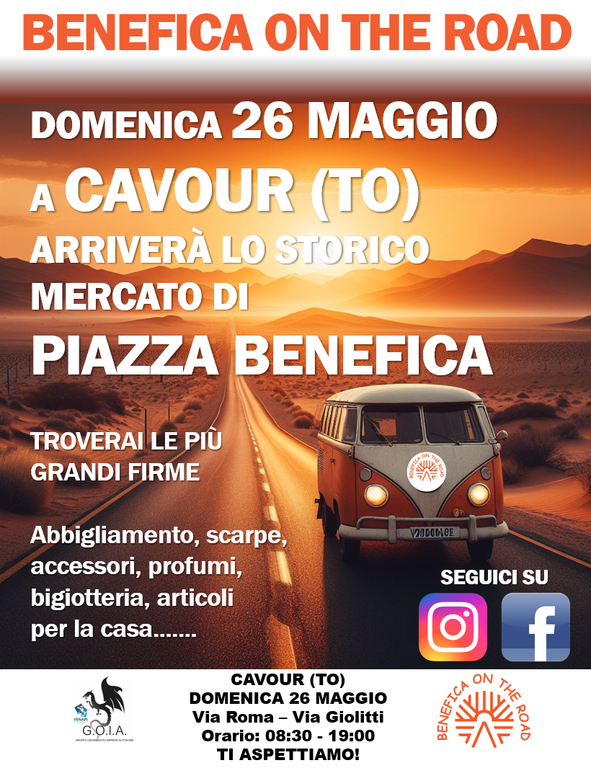 Dopo il successo di Poirino, PIAZZA BENEFICA ON THE ROAD torna, con nuove proposte, a CAVOUR, tra Via Roma e Via Giolitti, dalle 8,30 alle 19, dove gli storici stocchisti e ambulanti di Piazza Benefica porteranno le migliori marche e firme di abbigliamento, calzature e accessori Made in Italy con oltre 50 espositori per accontentare tutti i gusti e le esigenze di stile e di moda dei visitatori.