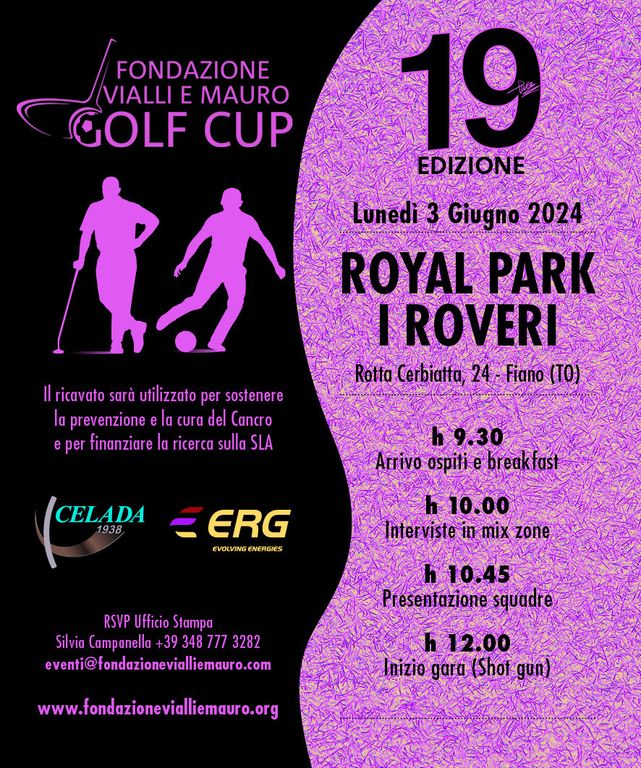 Professionisti, nomi illustri dello sport e dello spettacolo assieme agli amatori insieme, sullo stesso green, per una giornata di sport e solidarietà: il 3 giugno il Royal Park I Roveri di Fiano Torinese, gioiello immerso nella splendida cornice del Parco Naturale La Mandria e già teatro di numerosi eventi internazionali, ospita la XIX edizione della Fondazione Vialli e Mauro Golf Cup, la competizione che dal 2004 rappresenta un prezioso strumento per promuovere la raccolta fondi a favore della Ricerca sulla SLA – Sclerosi Laterale Amiotrofica, obiettivo che sta alla base dell’impegno della Onlus torinese.