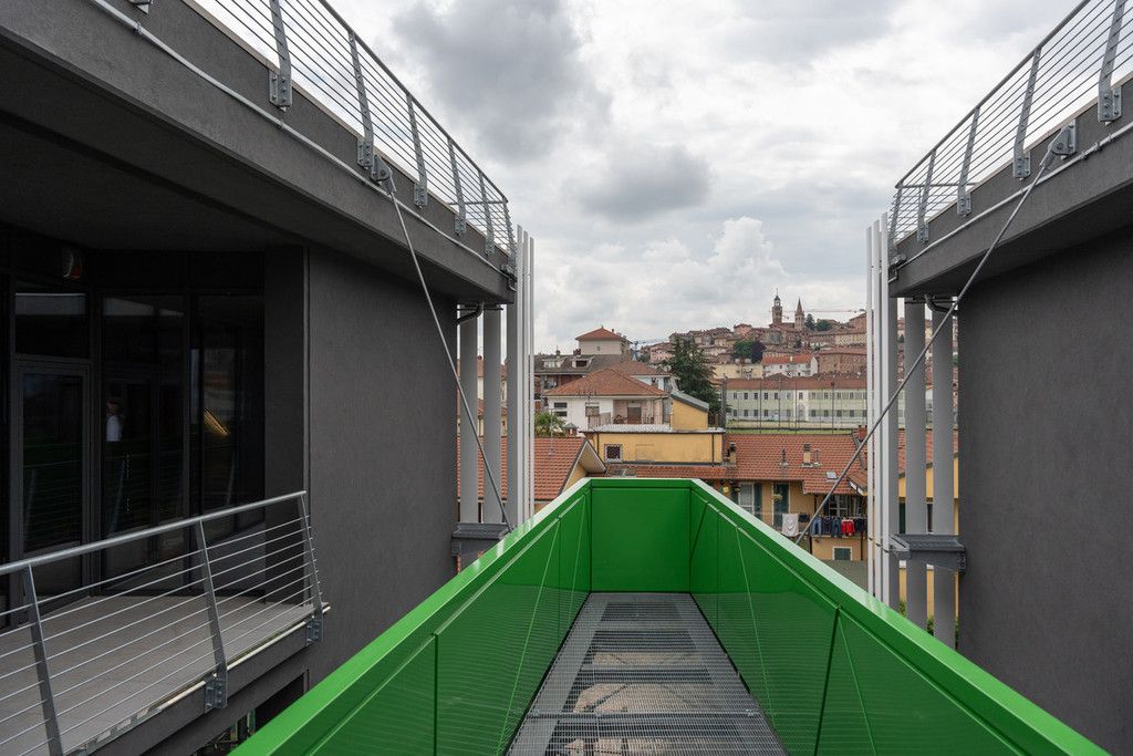 Dell'edificio che è alto più di 16 metri, sviluppato internamente nei diversi ambienti di lavoro con varchi aperti per la comunicazione tra i vari reparti, la struttura portante è un’altra innovazione realizzata in calcestruzzo armato precompresso (rivestito da un cappotto di 12 cm per ottimizzare le prestazioni energetiche). Al secondo piano dove trovano sede le società del gruppo: Iscat ( società di ricerca e sviluppo nel campo delle energie rinnovabili) e Gd System che opera nel campo della trasformazione tecnologica delle aziende, ci si tuffa nel cuore di Saluzzo e sulla catena del Monviso, attraverso un piccolo terrazzo proteso.