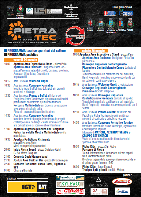 La seconda giornata di convegni, sabato 25 maggio, è riservata agli operatori del comparto lapideo: dai cavatori agli artigiani, dai posatori alle imprese edili. Ascolta le testimonianze dirette, scopri le nuove tecnologie, apprendi nozioni in tema di agevolazioni e bandi, a cura di Confartigianato Imprese Piemonte e Confartigianato Cuneo. “Costruire in pietra: opportunità a confronto – Tecnologia, normative, sostenibilità e strategie vincenti per un settore in continua evoluzione”. Dopo i saluti iniziali e la presentazione a cura di Giorgio Felici, Daniela Minetti e dell’Ing. Gianluca Odetto, gli interventi partiranno con l’Eurgeol. Grazia Signori “Certificazioni di prodotto per le pietre naturali: loro applicazione e come ottenerle” e su “Conservare, riqualificare e dare futuro alle pavimentazioni in pietra, tra saperi antichi ed esigenze contemporanee”. Toccherà poi al dott. Piero Primavori che parlerà di “Strumenti di protezione e promozione commerciale: a che punto siamo con la pietra naturale” e al dott. Renato Vautero su “Silice libera cristallina nella lavorazione della pietra: quali rischi per la persona?”. A concludere la mattinata sarà Roberto Maero con “Misure agevolative della Regione Piemonte in materia di efficientamento energetico e produttivo”.
