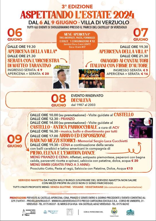 Prenotazioni (per visite al Castello e Antica Parrocchiale, apericena, cena, pranzo e serate) entro il giorno precedente all’evento: 329-216 9741, pro.villa@virgilio.it, www.villadiverzuolo.it, cartoleria Era (0175-85337), El Mercà d'la Vila (0175-86242).