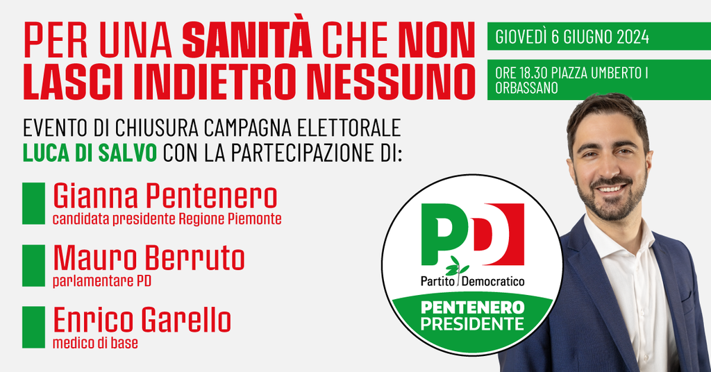 L’evento, oltre alle proposte migliorative portate avanti da Di Salvo, vedrà la partecipazione di Gianna Pentenero, candidata presidente Regione Piemonte; Mauro Berruto, parlamentare PD; Enrico Garello, medico di base.