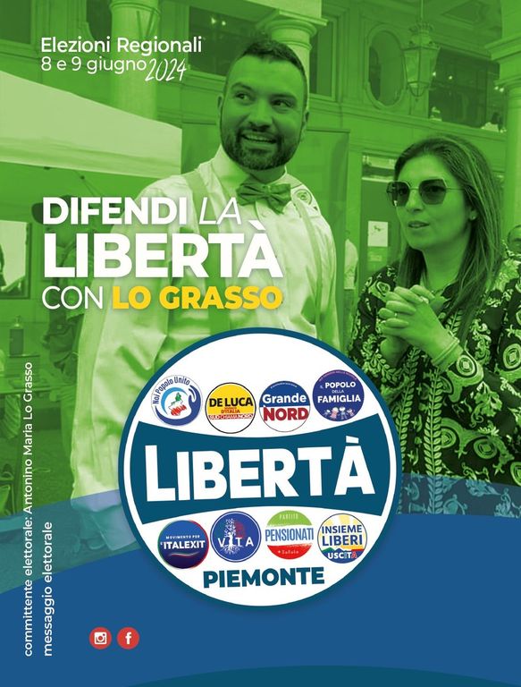 "Ho deciso di scendere in politica - è l'appello di Lo Grasso - perché non sono per nulla disposto a pagare per tutto questo e, se non lo sei nemmeno tu, alle elezioni regionali dell’8 e 9 giugno, sulla scheda verde, dei residenti in Torino e Provincia, fai una X sul simbolo “Libertà Piemonte” e scrivi “Lo Grasso”. #LibertàPiemonte #scriviLoGrasso".