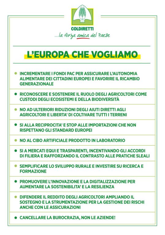 "Una questione chiave è il riconoscimento di un giusto reddito per gli agricoltori, per cui la PAC dovrà incentivare un modello che favorisca gli accordi di filiera affinché nella catena del valore non venga svantaggiato l’anello dei produttori. Altro punto fondamentale e centrale nell’azione che Coldiretti porta avanti da settimane è l’obbligo dell’indicazione di origine in etichetta per tutti gli alimenti e l’abolizione della regola del Codice doganale sull’ultima trasformazione che consente di italianizzare prodotti agroalimentari stranieri che hanno subìto lavorazioni minime in territorio nazionale. Nella difesa a 360 gradi del cibo rientra la richiesta di stop alle importazioni che non rispettano gli standard europei e italiani, facendo concorrenza sleale ai nostri produttori: è essenziale, secondo Coldiretti, introdurre il principio di reciprocità negli scambi commerciali. La difesa Coldiretti del cibo si basa anche sul no al Nutriscore, l’etichetta nutrizionale che inganna i consumatori e danneggia i prodotti di qualità, e al cibo realizzato in laboratorio. Grazie alla Coldiretti e alla sua grande mobilitazione con la raccolta di due milioni di firme, la questione dei prodotti alimentari artificiali è diventata di dominio pubblico e l’Italia ha varato una legge che vieta produzione, trasformazione e importazione di cibi sintetici, che è diventata un modello. Dodici Paesi dell’Unione Europea, infatti, hanno sottoscritto un documento che prevede una moratoria sul cibo a base cellulare e dall’altra parte dell’oceano Florida e Alabama hanno varato una normativa analoga a quella italiana. Coldiretti chiede la semplificazione delle regole dello Sviluppo rurale e il rafforzamento degli investimenti in ricerca (a partire dalle TEA) e formazione. La promozione dell’innovazione deve diventare, per Coldiretti, un driver dell’Unione europea. Tra le proposte una campagna di sostegno all’agricoltura di precisione, investimenti europei per sistemi di intelligenza artificiale per superare i ritardi su questo fronte presidiato dai giganti tech di Stati Uniti e Cina.