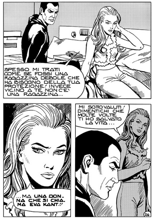 E in Italia? Beh, la riscossa delle donne da noi è rappresentata senza dubbio da Eva Kant, la compagna di Diabolik. Già rivoluzionaria sin dalla sua prima apparizione nel numero 3 della serie (1963), in cui salva Il Re del terrore dalla ghigliottina, cresce negli anni fino ad acquistare un carattere e un’identità molto forti. Da spalla diventa compagna, un ruolo che la mette alla pari del suo uomo e che lei rivendica con decisione.