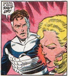 In queste vignette vediamo l’unico componente femminile dei Fantastici Quattro. Susan Storm, altrimenti detta “la ragazza invisibile”. Ai suoi esordi è piagnucolosa, un po’ imbranata, più efficiente nei lavori di casa che nella lotta al crimine. Spesso viene presa prigioniera dai nemici del quartetto e i suoi compagni sono costretti a fare doppio lavoro per liberarla e sconfiggere la minaccia di turno. Se si ribella alla sua condizione di inferiorità, son sberle.