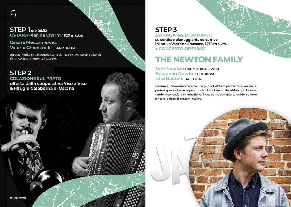 Con una escursione di 30 minuti su sentiero pianeggiante e arrivo in loc. La Vardetta, Paesana, 1576 s.l.m. il pubblico potrà scoprire un’altra perla paesaggistica della Val Po, ascoltando la NEWTON FAMILY, ovvero Tom Newton all’harmonica e alla voce, Benjamin Newton alla chitarra e Lillo Dadone alla batteria.