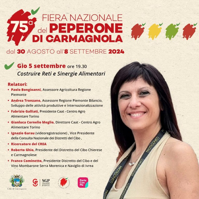 Siamo lieti di annunciare la partecipazione di Simona Riccio - LinkedIn Top Voices Italy | Agrifood & Organic Specialist e founder di Parla Con Me® alla 75/a edizione della Fiera Nazionale del Peperone di Carmagnola, che si terrà dal 30 agosto all'8 settembre 2024. Questo evento rappresenta un appuntamento culturale e gastronomico di grande rilievo, celebrando uno dei prodotti più pregiati e caratteristici del nostro territorio.