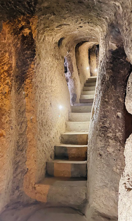Continua l’esplorazione, questa volta scendiamo nel sottosuolo. Kaymakli, la città sotterranea più importante per estensione e stato di conservazione, è un’esperienza surreale dove attraverso gli stretti cunicoli a piccoli passi entriamo nella quotidianità, di un mondo passato; i primi cristiani si rifugiavano qui, per scappare dalle persecuzioni religiose. Otto livelli scavati nella roccia fino a 90 metri di profondità, dove una comunità di oltre 2000 persone viveva in alcuni periodi; ciò che stupisce maggiormente è l’organizzazione degli ambienti: cucine, dormitori, magazzini, bagni e condotti di ventilazione, ancora oggi sono ben identificabili e sopravvissuti all’erosione. Il gruppo tra selfie ed emozione è stanco, ma pronto a concludere il viaggio.