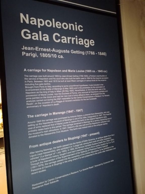 Come ricordato da Marta Fusi, direttrice della Palazzina di Caccia, questa è una delle pochissime tra le 20 carrozze appartenute a Napoleone ancora esistenti e viene monitorata costantemente dal centro di conservazione della Reggia di Venaria, che durante la pandemia aveva effettuato le operazioni di restauro, prima di essere messa in mostra da maggio del 2021 alla Reggia di Venaria nella mostra dedicata a Napoleone. Adesso è scoccata l'ora del suo ritorno a Stupinigi.