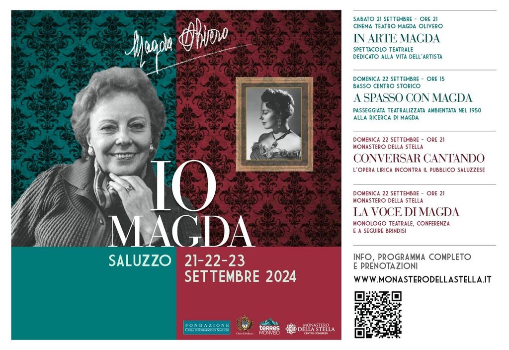 Domenica 22 settembre, nel pomeriggio, in “A SPASSO CON MAGDA”, il pubblico partecipante potrà compiere un viaggio nel tempo: il basso centro storico saluzzese ritornerà “magicamente” al 1950, l’anno che precede il rientro sulle scene dell’Artista e che, con un po’ di immaginazione, potremmo immaginare in visita alla sua città natale in compagnia del marito. A conclusione della passeggiata, nella Chiesa della Croce Nera il pubblico potrà sperimentare, con ironia e divertimento, “i brividi musicali“ del canto lirico, con gli spettacoli del gruppo torinese Comicoro.