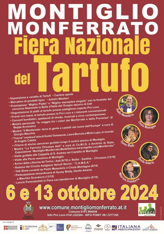 Chiosa infine Dimitri Tasso: “Il circuito delle 5 Fiere del Tartufo del Basso Monferrato, alias Montiglio Monferrato, , Moncalvo, Montechiaro d’Asti, San Damiano D’Asti e Murisengo dimostra unità e lungimiranza in tema di promozione del territorio. Con ‘LocoMonferrato’ Montiglio si riconferma Comune interessante, tra i 22 finanziati in tutta Italia per i progetti turistici legati alle microaree, insieme ai confinanti Murisengo e Piovà Massaia, in tema mobilità sostenibile e promozione delle architetture del Romanico. Chiudono il cerchio il progetto ’TABUI’, app dedicata ai luoghi da visitare in zona, e la forte interazione fra giovani e trasporti quale liason efficace a continuare a dare linfa ai nostri amatissimi borghi. Vi aspetto tutti in Fiera”.