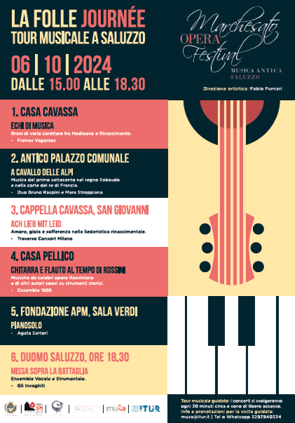 Secondo appuntamento del Marchesato opera Festival domenica 6 ottobre con la "Folle Journée", un intero pomeriggio dedicato alla musica antica e classica nei luoghi di importanza storico artistica della Città di Saluzzo.