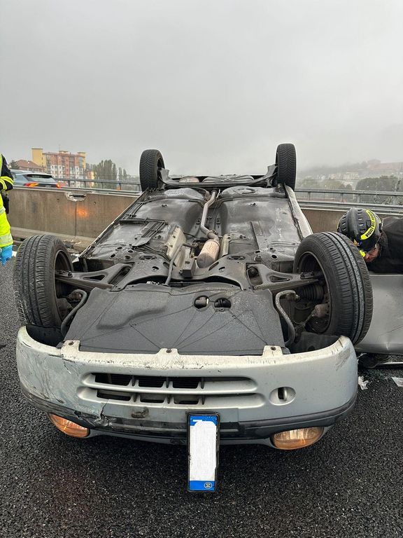 Due i feriti, trasportati in codice giallo in Pronto Soccorso. Impressionante l'incidente sulla sopraelevata, con un'auto completamente ribaltata