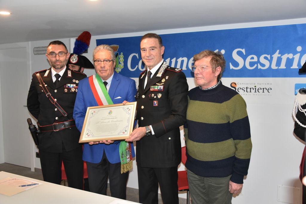 Il Sindaco Poncet e tutta la sua Giunta hanno consegnato al Generale Andrea Paterna una targa con la seguente dicitura - “All’Arma dei Carabinieri di Sestriere, presente sul territorio dal 1946, esprimiamo la nostra riconoscenza per il costante supporto dimostrato nei confronti di questa comunità. Questo senso di gratitudine deriva dalla vicinanza costante espressa dall’Arma nei confronti dei nostri cittadini durante i decenni di presenza sul territorio, garantendo sicurezza, rispetto della legalità e delle norme di civile convivenza, nonché il prezioso aiuto offerto a tutti i cittadini con particolare attenzione alle persone più fragili anche durante i periodi più critici. Desideriamo inoltre sottolineare il preziosissimo supporto garantito dal vostro personale durante lo svolgimento degli eventi sportivi internazionali che hanno costantemente interessato la località con particolare riferimento ai Mondiali di Sci Alpino del 1997, i Giochi Olimpici Invernali di Torino 2006, le varie tappe di Coppa del Mondo di Sci, del Giro d’Italia e del Tour de France”.