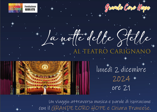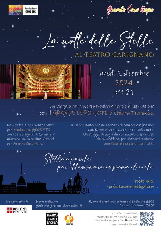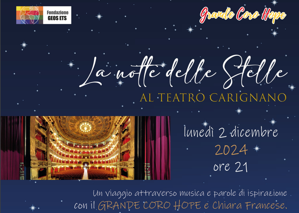Nella meravigliosa bellezza del Teatro Carignano risalente al 1700 e situato nel cuore di Torino, e con la generosa collaborazione della Fondazione Teatro Stabile, Fondazione GEOS ETS è la promotrice di un concerto di beneficenza tenuto dal Grande Coro Hope con il patrocinio della Regione Piemonte e del Coordinamento Nazionale delle Comunità di tipo familiare per Minorenni.
