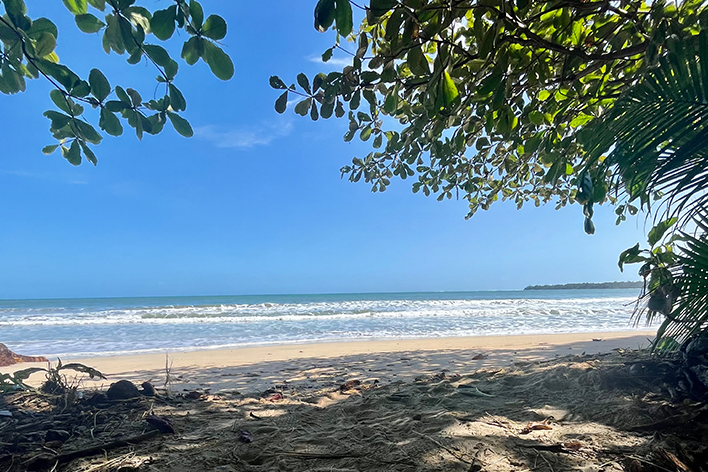 Il giorno successivo a pochi chilometri ci aspettava Puerto Viejo de Talamanca, il cuore pulsante dei Caraibi costaricani. Il paesaggio è cambiato rapidamente: la giungla ha lasciato spazio alle palme e le strade polverose ci hanno accolti con piccoli bar dal sapore bohémien. Puerto Viejo è un crocevia affascinante, dove la cultura afro-caraibica si fonde con lo spirito libero dei surfisti e l’energia dei viaggiatori di passaggio. Abbiamo trascorso una giornata perfetta: mercatini colorati, musica dal vivo e bagni al tramonto a Punta Uva. Da non dimenticare una cena memorabile a base di Rondòn, la zuppa creola di pesce e cocco tipica di questa Terra. Le stradine di terra, fiancheggiate dalle casette di legno dai colori brillanti anche la sera, ci hanno fatto sentire parte di questo mondo semplice ed autentico. Infine, siamo arrivati a Manzanillo, quasi al confine con Panama, dove la giungla si tuffa letteralmente nell’oceano. Qui, tra pescatori locali, palme altissime e una pace irreale, mi sono fermato un momento a riflettere, grato per quello che questo viaggio mi aveva regalato.