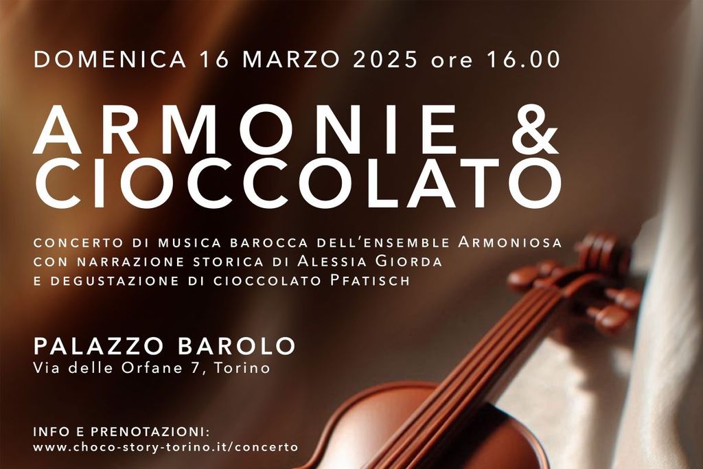 C’è un’arte che incanta l’udito e un’altra che seduce il palato: dalla fortunata collaborazione tra il Museo del Cioccolato e del Gianduja e l’Opera Barolo, nasce l’evento che associa la musica eseguita dall’ensemble Armoniosa di Asti ai racconti sulla storia del cioccolato narrati da Alessia Giorda e alle degustazioni di cioccolato della storica pasticceria Pfatisch.