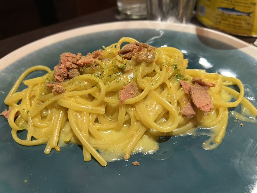 Non allo stesso livello le Linguine con bottarga di tonno, burro allo zafferano e bucce candite di limoni e arance nelle quali il prevalere della bottarga lascia decisamente in ombra gli altri sapori.