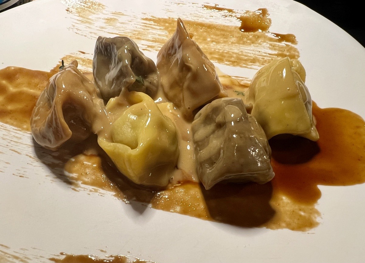 interessanti i Plin di giovenca maturata in tre cotture: normale, paprika, aglio nero (Ma, tenuto conto delle dimensioni, bisogna proprio chiamarli “plin”?)