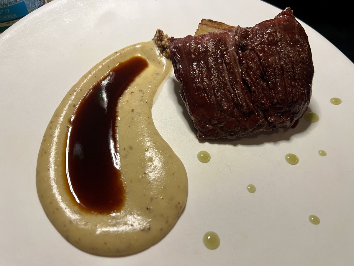mentre più consueto il Diaframma di giovenca, terrina di patate, lardo e senape.