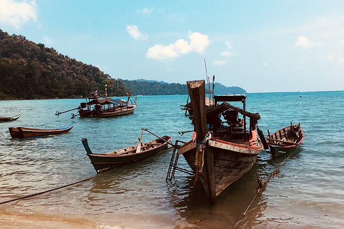 C’è una Thailandia che sfugge ai radar. Non scintilla nei resort di Phuket né si lascia imbrigliare in itinerari preconfezionati. Va cercata ai margini della mappa, dove la natura detta ancora i ritmi e il viaggio diventa scoperta. L’ho incontrata tra le isole Surin e la giungla d’acqua di Khao Sok: due luoghi che invitano — dolcemente — a svuotarsi delle abitudini. La barca parte da Kuraburi all’alba. Il motore vibra nella schiena, l’orizzonte si scioglie in una linea liquida. A bordo siamo pochi, zaini compressi, sguardi tra sonno e attesa. Sul molo ci hanno pesati — letteralmente — per calcolare il carico. L’accesso alle isole è contingentato: un ecosistema fragile che si protegge così dal peso eccessivo dell’umanità. Dopo un’ora e mezza di navigazione, le Surin emergono dal mare delle Andamane come un arcipelago dimenticato. Cinque isole protette da un parco nazionale marino, casa di tartarughe e coralli millenari. Il mare è trasparente fino all’osso, la sabbia chiarissima si arrende alla natura selvaggia che scende fino a riva.