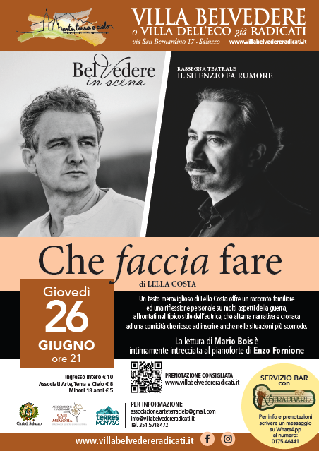 Sulla collina di Saluzzo, nel parco di Villa Radicati Belvedere, sul terrazzo che si affaccia sulla città, torna “BelVedere in scena” con la rassegna teatrale “Il silenzio fa Rumore”. Giovedì 26 giugno alle 21, in via San Bernardino 17, andrà in scena lo spettacolo teatrale “Che faccia fare” scritto da Lella Costa.