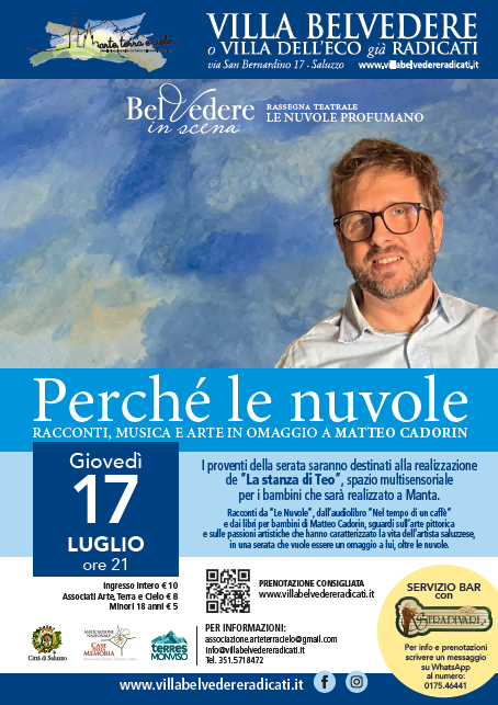 Giovedì 17 luglio, alle 21, il giardino terrazzato del parco di Villa Belvedere Radicati (via San Bernardino 17 Saluzzi) ospiterà nell’ambito di “BelVedere in scena”, la rassegna Le nuvole profumano, dedicata al ricordo di Matteo Cadorin, scomparso lo scorso novembre all’età di 48 anni.