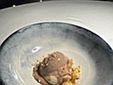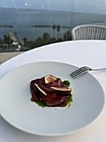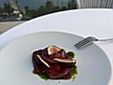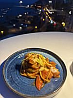 Tra le portate servite: ostrica fritta con bisque di gamberi e salsa al caramello; carpaccio di tonno con fichi freschi, cipolla in agrodolce e salsa alle foglie di fico; risotto ai gamberi di Sanremo e tartufo nero; tagliolino con gamberi, zafferano e fiori di zucchina.