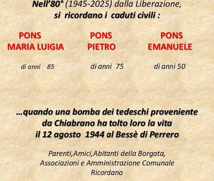 “Rendiamo omaggio alle lapidi, ai cippi, ai monumenti, disseminati nelle nostre vallate e ci inchiniamo ancora una volta davanti al sacrificio di quelle persone, partigiani, combattenti, civili, donne, uomini, che sono diventati il simbolo della libertà e della democrazia del nostro paese”. Con queste parole, la sezione Anpi di Perosa Argentina e Valli introduce i 4 appuntamenti di agosto per ricordare chi ha perso la vita per lottare per la liberazione dal nazifascismo. Il primo appuntamento è domani, domenica 3 agosto, alle 11, a Chasteiran di Bourcet, nel Comune di Roure. Venerdì 8 agosto, invece, doppio appuntamento a Perrero. Alle 9 il ritrovo in borgata Bessè, dove verrà posta una targa in ricordo di Emanuele, Pietro e Maria Luigia Pons, caduti in una rappresaglia. Alle 10,30, ci si sposterà a Rocca Linsard, sempre nel Comune di Perrero, dove verranno commemorati i partigiani Pietro Cagliè, Stefano Giacalone e Luigi Giai. Infine, martedì 19 agosto, alle 9,30, ci si ritroverà a Villa di Prali, per poi raggiungere Ghigo e borgata Pomieri. Mentre nel pomeriggio, alle 15,30, l’appuntamento è in località Piccolo Passet a Massello per deporre una corona alla lapide di Enrico Gay.