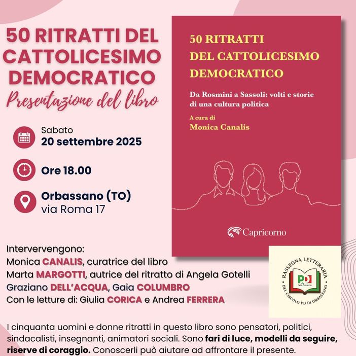 Sabato 20 settembre alle ore 18 verrà presentato a Orbassano il volume “50 ritratti del Cattolicesimo democratico. Da Rosmini a Sassoli: volti e storie di una cultura politica” curato da Monica Canalis ed edito da Capricorno, con la postfazione di Ernesto Maria Ruffini.