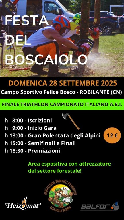 Non si tratta di una semplice manifestazione folkloristica, ma della finale del Campionato Italiano A.B.I. (Associazioni Boscaioli Italiane) di Triathlon del Boscaiolo, che radunerà concorrenti da tutta Italia per una competizione mozzafiato tra motoseghe ruggenti, accette affilate e tronchi maestosi.